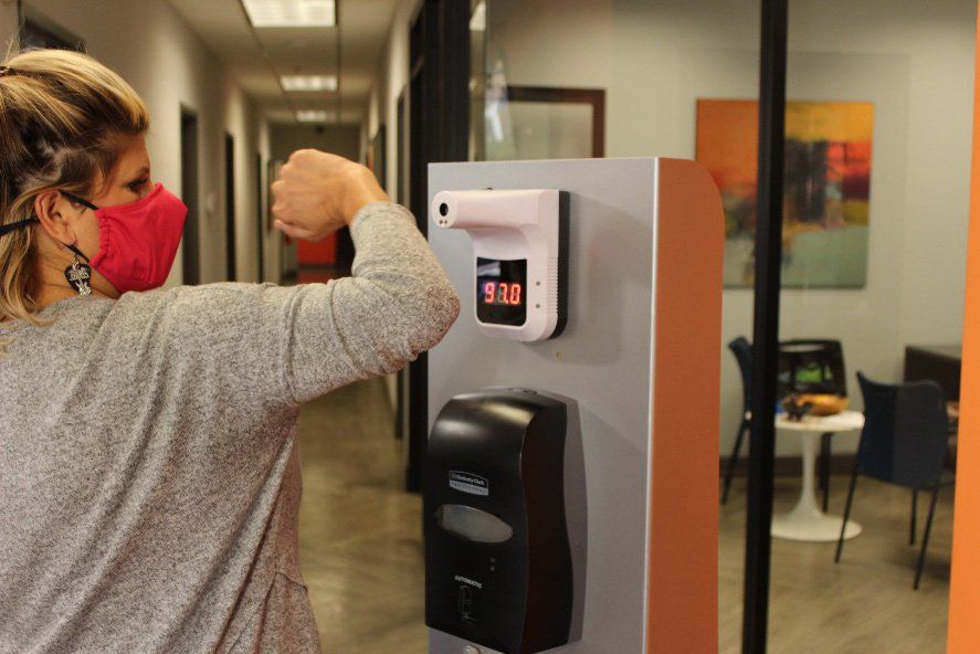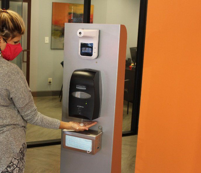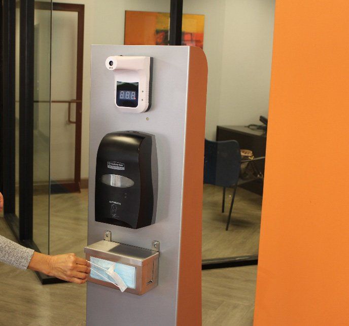 Our new Entryway Wellness Station features a temperature scanner, hand sanitizer, and mask dispenser.